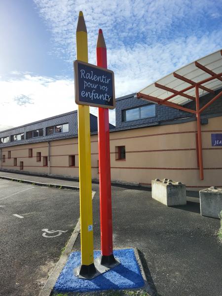 Un panneau indiquant l’école est installé devant l’entrée maternelle pour inciter les automobilistes à ralentir.