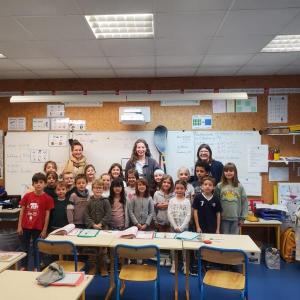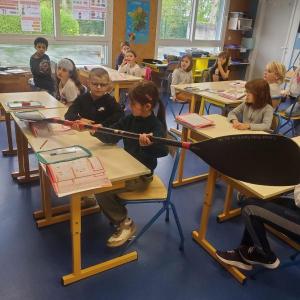 Elle nous a expliqué son sport. Elle nous a présenté quelques équipements (pagaie et casque) et 2 médailles. Nous avons pu essayé, chacun notre tour, de pagayer !