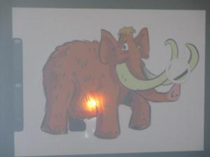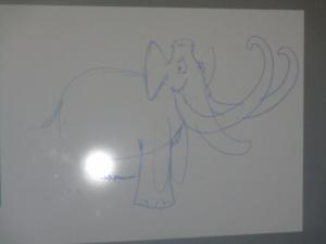 Sur sa tablette, il a dessiné ce que nous lui avons demandé : un mammouth, des montagnes, de l’herbe avec des fleurs, des nuages, un soleil et des oiseaux.