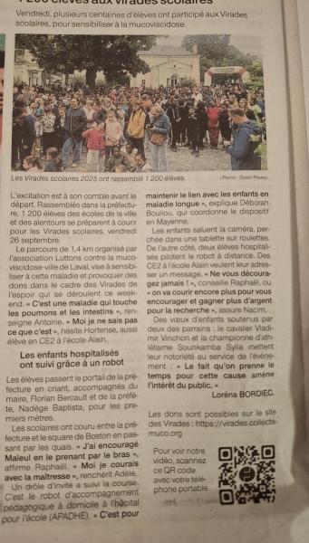 Vendredi 26 septembre ont eu lieu les Virades de l’Espoir. Les classes de CP, CE1, CE2 et CM1 de l’école ont participé à cet évènement. Vous pouvez retrouver quelques photos ci-dessous ainsi qu’un article du Ouest France dans lequel des élèves de CE2 sont interviewés !