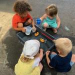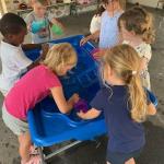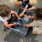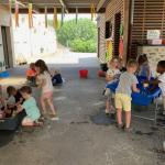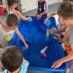 Ce mardi 1er juillet après-midi, nous étions bien installé à l’ombre sous le préau pour profiter des bacs remplis d ‘eau. Nous avons manipulé différents types de matériel pour remplir, transvaser, verser, faire flotter ou bien couler les objets et bien d’autres choses encore.