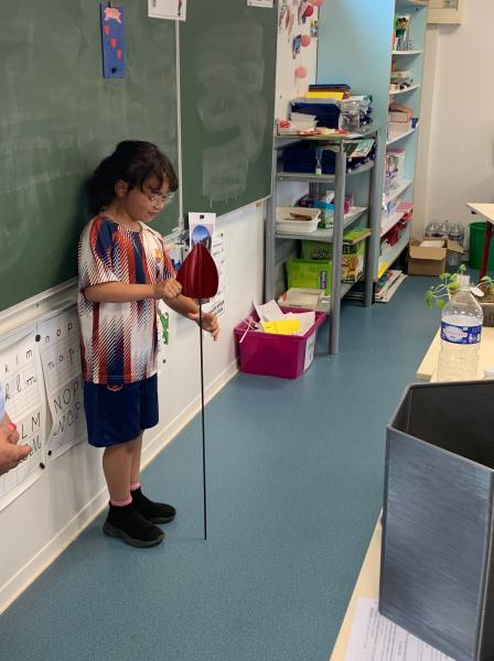 Inaïya nous a présenté un outil pour effrayer les taupes et les faire fuir. On enfonce l’outil dans une butte de taupe et quand il y a du vent ça le fait tourner et ça fait trembler la terre, ce qui fait partir les taupes.