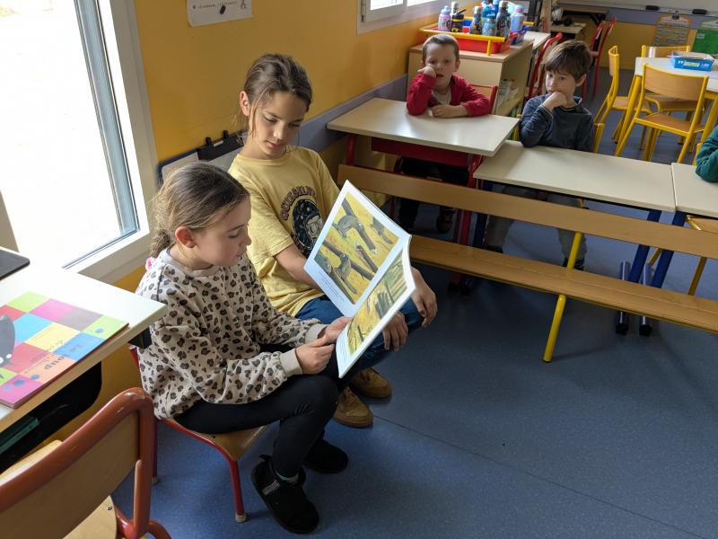 Les élèves de CM1 et CM2 viennent lire des histoires aux élèves de Grande Section chaque lundi en début d’après-midi. Les plus grands, après s’être bien entraînés, s’appliquent à lire à haute voix avec le ton et les plus jeunes sont très attentifs car après ils doivent répondre à des questions ensuite. C’est un moment très apprécié de tous.