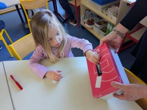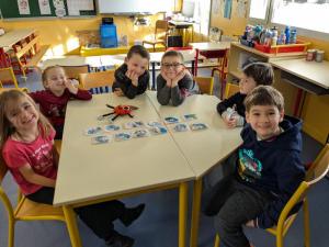 Parmi les élèves de Grande Section, quatre enfants se sont portés candidats : Olivier, Erwan, Sacha et Mylann. Il fallait choisir deux candidats parmi les quatre et entourer leur photo. Ensuite, il fallait plier le bulletin de vote et le glisser dans l’urne.