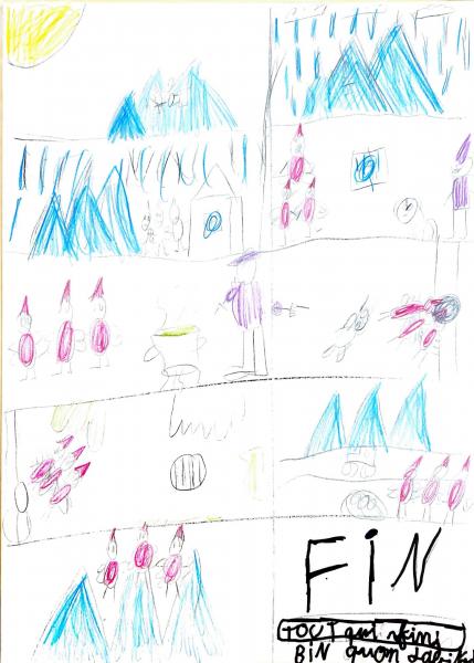 Les métiers sont des choses qu’on fait le matin, il y a blogger, interviewer, meteorologist,… Les bloggers écrivent des articles,les interviewers posent des questions, les meteorologists font la météo, les secretaries font le cahier pour la cantine et le registre d’appel, les little teachers font le tableau, les billstickers font des affiches et les librarians enlèvent et mettent de nouveaux livres .